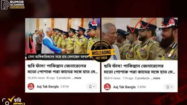 ভারতের জনপ্রিয় সংবাদমাধ্যম 'আজতক বাংলা' সম্প্রতি এক ভিডিও প্রতিবেদনে দাবি করে, নোবেলজয়ী ড. মুহাম্মদ ইউনূসের সঙ্গে হাত মেলানো ব্যক্তিরা নাকি পাকিস্তানি সেনা কর্মকর্তা। তারা একটি ছবি দেখিয়ে প্রশ্ন তোলে, “বাংলাদেশ সেনার পোশাক তো এমন নয়, তাহলে তারা কারা? পাকিস্তানি সেনা?”